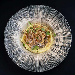 Бефстроганов из мягкой говядины со сливочным пюре картофеля с пикантным маринованным огурчиком и луком фри.