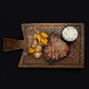 Сочная мягкая свинина на углях с печёным картофелем в сочетании с яблочным соусом. Свиная шея, картофель, яблоко, бекон, сливки, чеснок, тимьян. Аллергены: чеснок, тимьян, сливки 140/120/40.