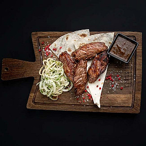 Маринованая мякоть фермерской говядины на гриле с томатным соусом свежей зеленью и лавашом.