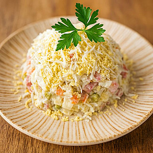 Классический салат Оливье по традиционному рецепту. Варёные овощи и зелёный горошек в сочетании с колбасой, яйцом и нежным майонезом. Лёгкий, но сытный салат, знакомый каждому.