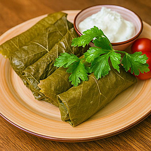 Традиционная кавказская долма из рубленой говядины с рисом и пряностями, завернутая в виноградные листья. Подаётся с ароматным чесночным соусом.