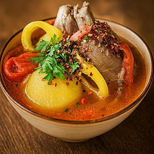 Традиционное кавказское блюдо из сочной баранины, тушённой с картофелем, овощами и луком. Медленное приготовление позволяет мясу стать мягким и пропитанным ароматами специй и зелени.