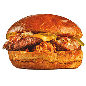 Этот бургер — настоящая находка для ценителей мраморной говядины. Сочная котлета из мраморной говядины, обжаренный бекон, ароматный чеддер, а также лук и маринованные огурцы — всё это подаётся на мягкой булочке бриошь с соусом камбэк.