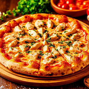 Сочная и питательная пицца на хрустящем тесте с мягкой, тянущейся корочкой. Основу покрывает ароматный томатный соус, сверху — нежные кусочки куриной грудки и щедрый слой плавленого сыра, который расплавляется до золотистой корочки. Для дополнительного аромата можно добавить немного свежей зелени или лёгкий штрих специй. Идеальный выбор для тех, кто ценит насыщенный вкус курицы с сырной нежностью.